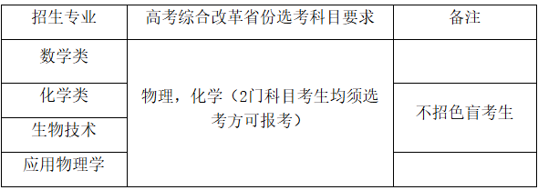 学校强基计划招生专业为数学类、化学类、生物技术、应用物理学。