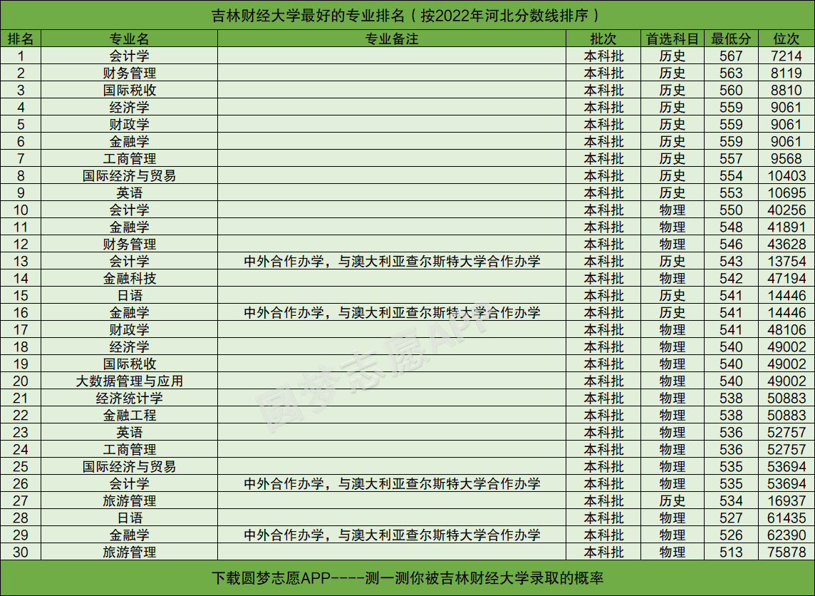 由于吉林省招生考试院目前还未公布2022年的专业分,所以本文将以吉林财经大学在河北2022年高考的录取情况为例,为大家展示吉林财经大学最好的专业排名。
