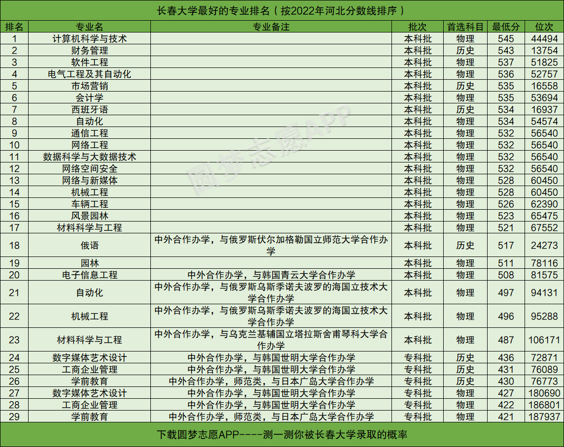 由于吉林省招生考试院目前还未公布2022年的专业分,所以本文将以长春大学在河北2022年高考的录取情况为例,为大家展示长春大学最好的专业排名。