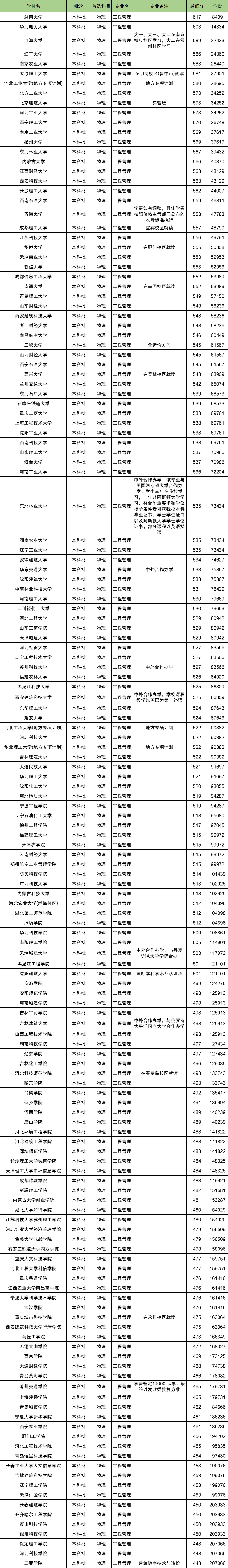 全国大学在工程管理专业上,招收物理类考生有133所大学,其中分数最高为617分的湖南大学,分数最低为448分的三亚学院。