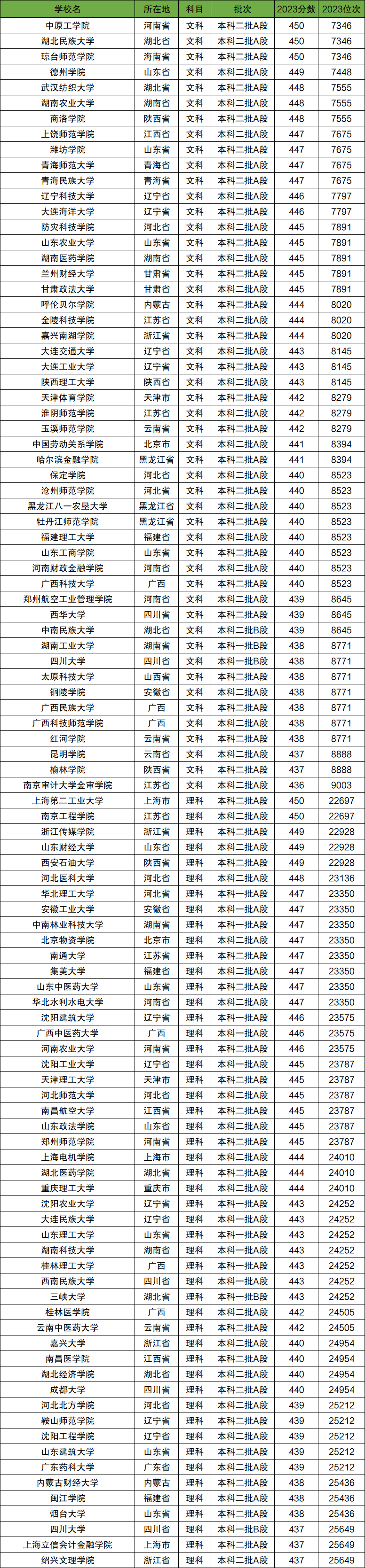 以下为2023年在吉林省400到450分的全国大学名单(吉林省以外)。