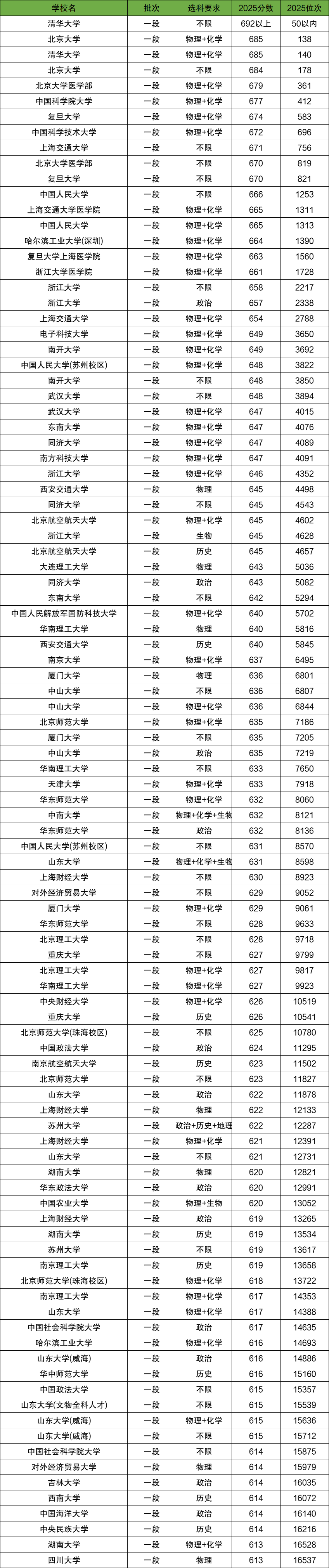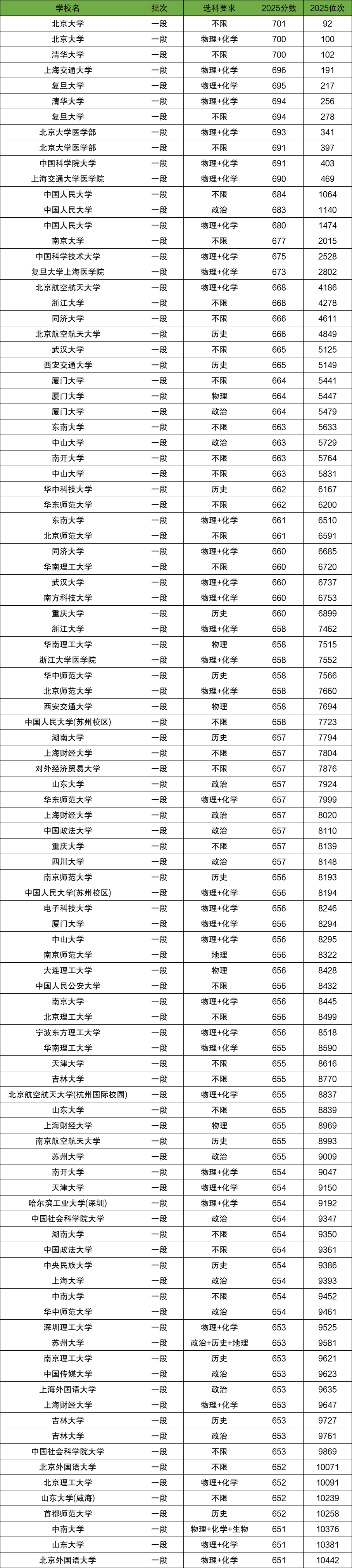 2025年全国各大学在山东录取分数线及位次,排名前十的院校是: