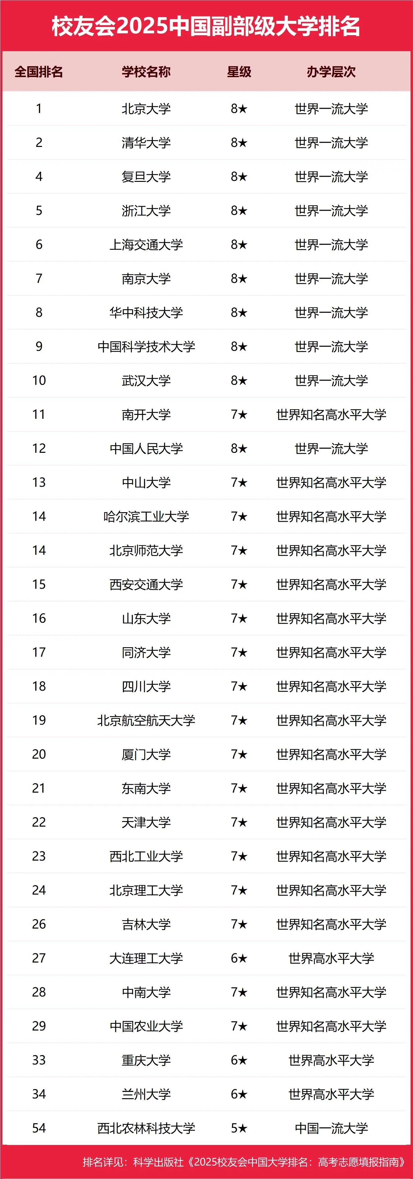 下面是中国所有副部级大学名单及全国排名一览表(排名根据校友会大学排行榜整理):