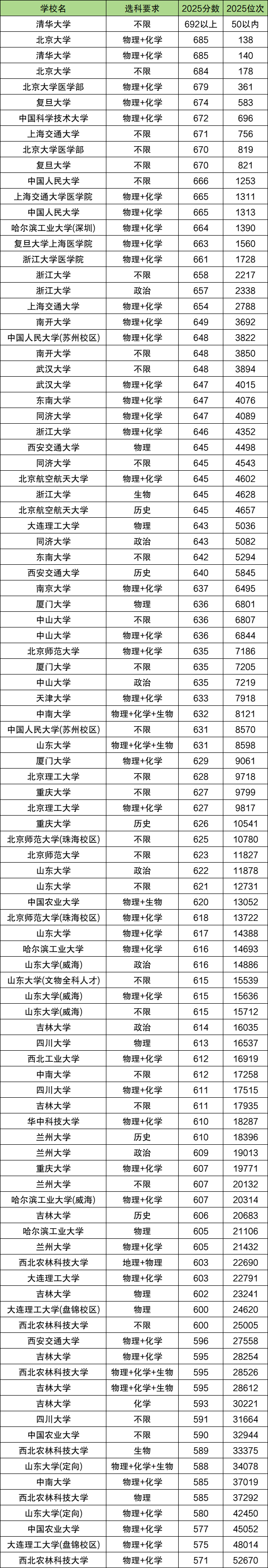 录取分数线最高的是清华大学(不限组),2025年最低分在692分以上,位次在50名以内。分数线较低的几所有:大连理工大学(盘锦校区)575分(物理+化学组)、中国农业大学577分(物理+化学组)、山东大学定向580分(物理+化学组)。