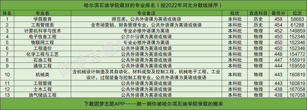 由于黑龙江省招生考试院目前还未公布2022年的专业分,所以本文将以哈尔滨石油学院在河北2022年高考的录取情况为例,为大家展示哈尔滨石油学院最好的专业排名。