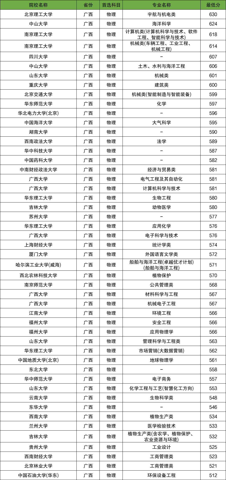 下表为所有大学在广西壮族自治区物理类的专业及分数线。