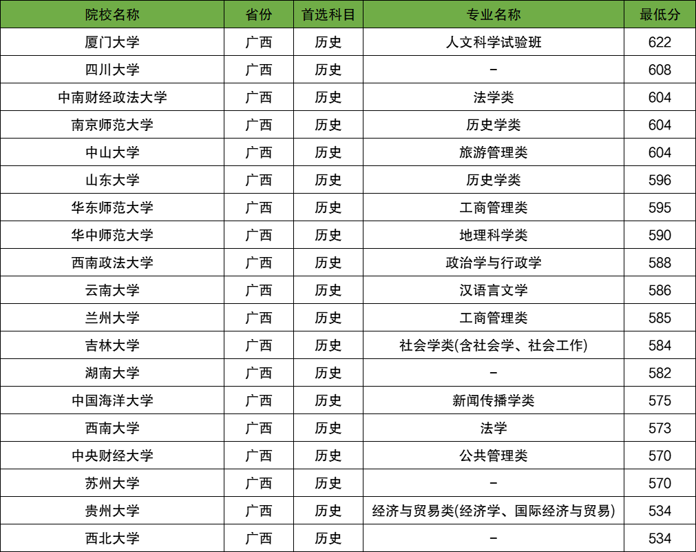 下表为所有大学在广西壮族自治区历史类的专业及分数线。