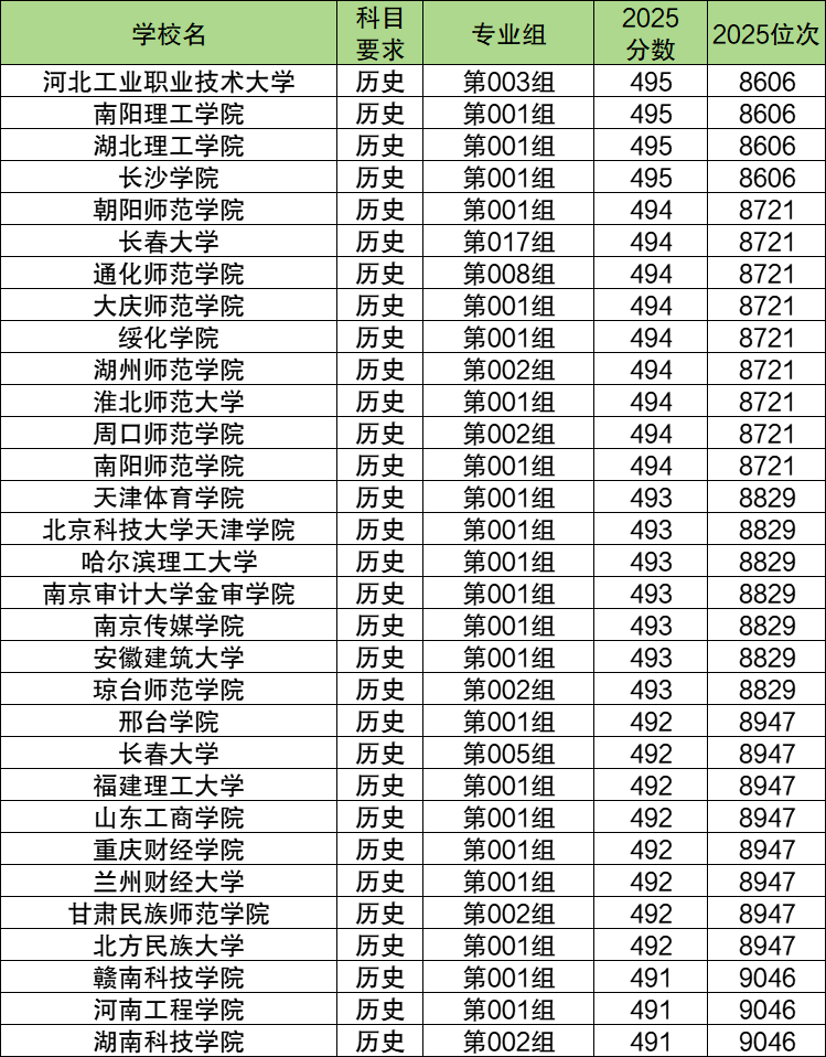 2025年吉林历史类特控线附近(491分到495分)能上的本科院校一共有30个,排名靠前的有河北工业职业技术大学(第003组,8606名)、南阳理工学院(第001组,8606名)、湖北理工学院(第001组,8606名)等,这些属于特控线附近考生可以冲一冲的学校。