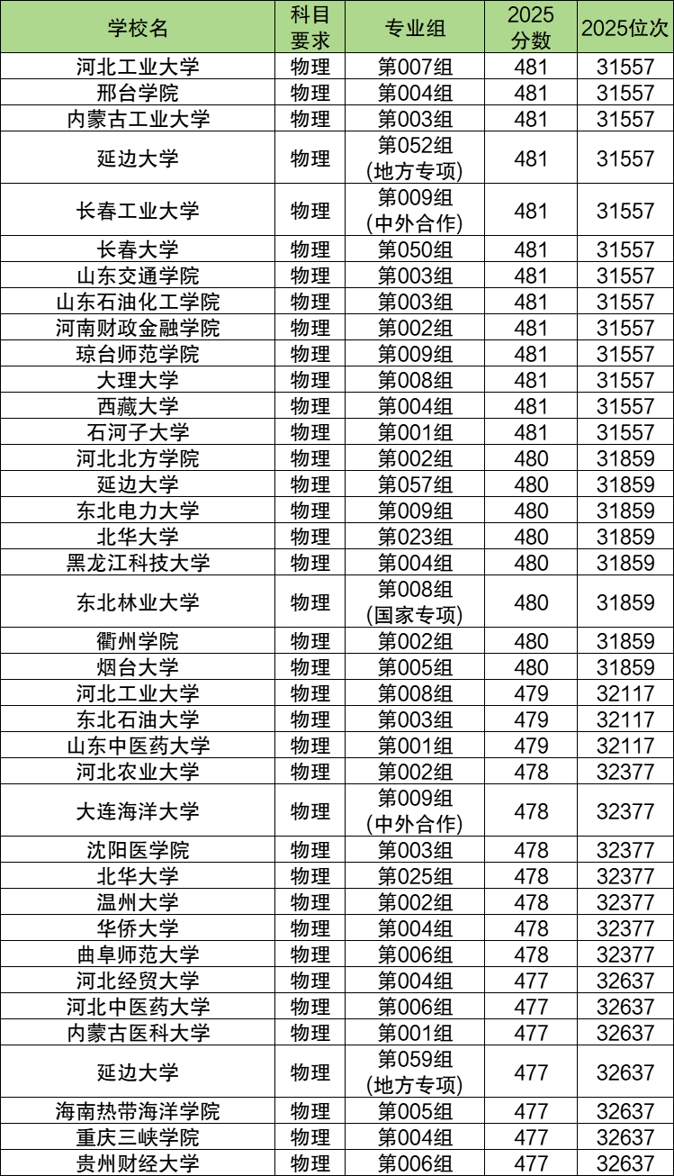 2025年吉林物理类特控线附近(477分到481分)能上的本科院校一共有34个,排名靠前的有邢台学院(第004组,31557名)、内蒙古工业大学(第003组,31557名)、延边大学(第052组(地方专项),31557名)等,这些属于特控线附近考生可以冲一冲的学校。