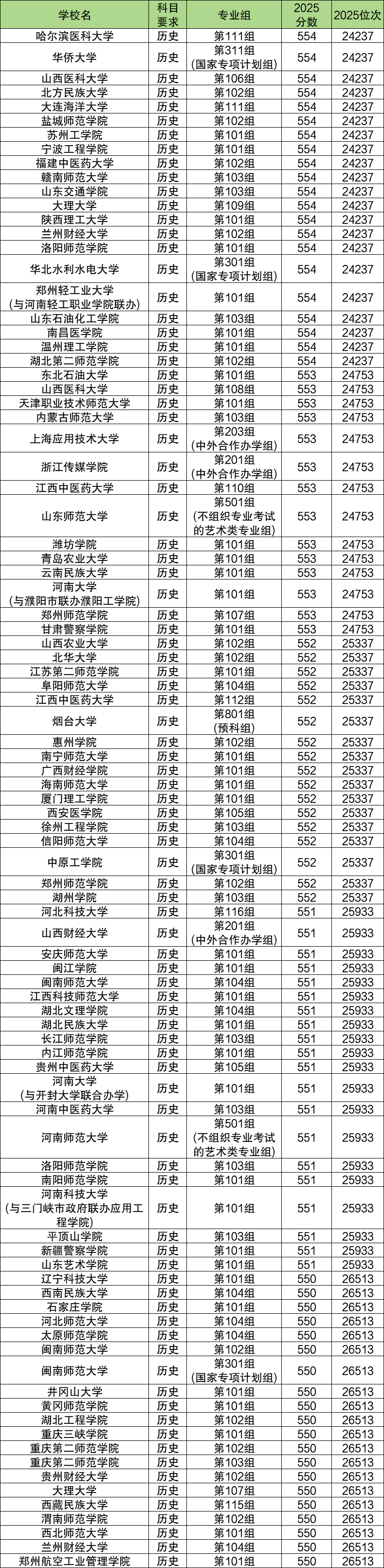历史类:特殊类型招生控制分数线为552分,对应位次是25337名。