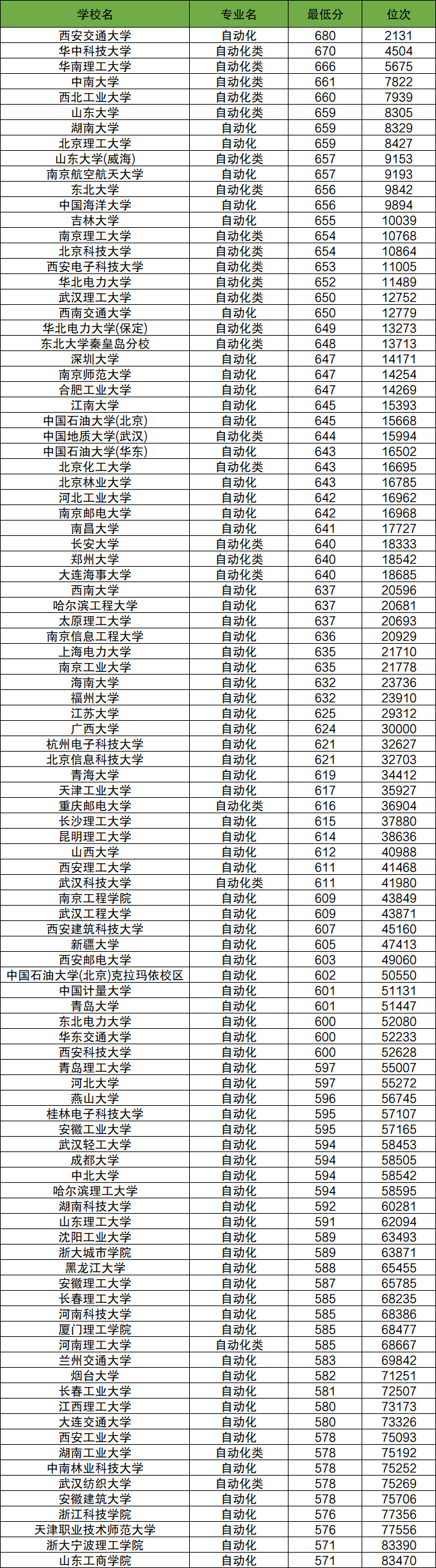 以下为全国自动化专业在浙江省的分数线前100名大学,上文已介绍最好的大学多少分能上。想要考上自动化专业的最低分并不高,为504分,只要在全省157696名以上就有机会。