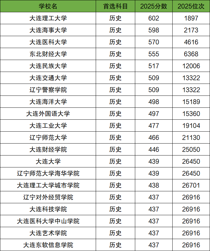 按照大连所有本科大学2025年在市内(本科批)录取分数线高低排名,为同学们整理以下内容: