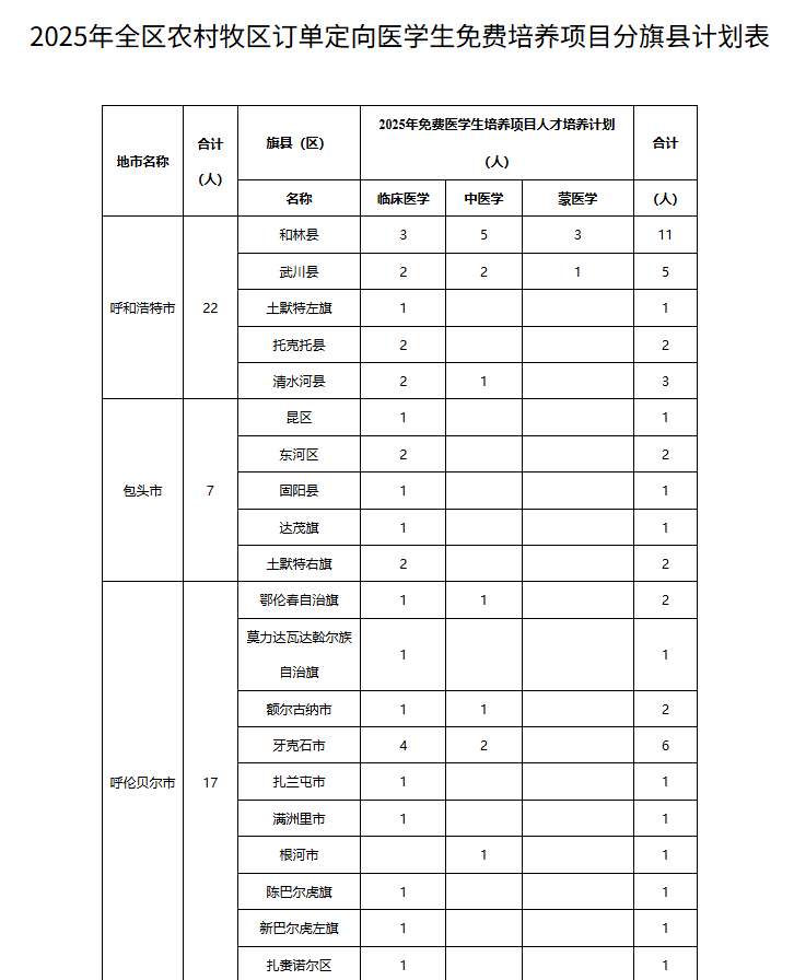 2025年内蒙古定向医学生招生计划为217人,其中内蒙古医科大学临床医学专业40人,中医学专业37人,赤峰学院20人,其中临床医学专业20人等。2024年内蒙古免费医学生录取分数线是:内蒙古民族大学中医学专业录取分数线最低是496分,最低排位22423名,定向到额尔古纳市等。