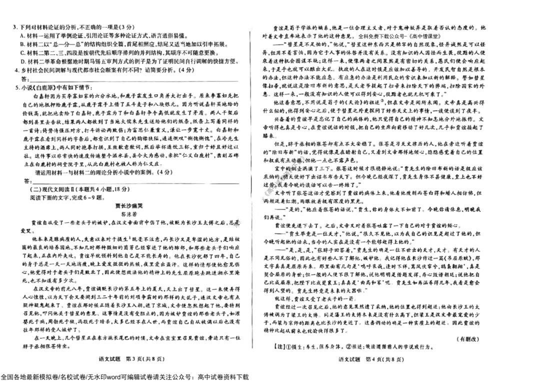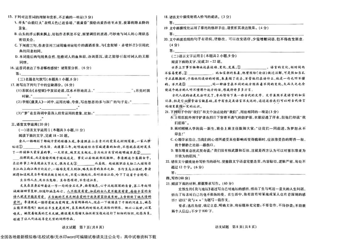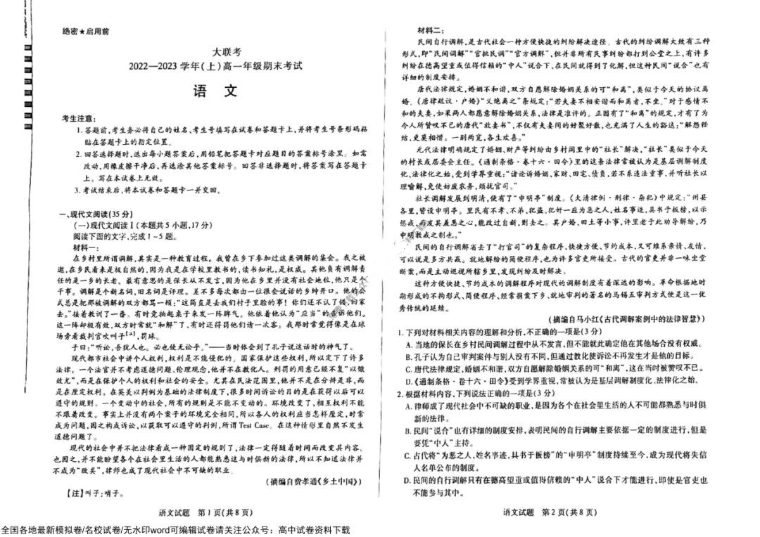 天一大联考2022-2023高一期末考语文试卷及答案汇总