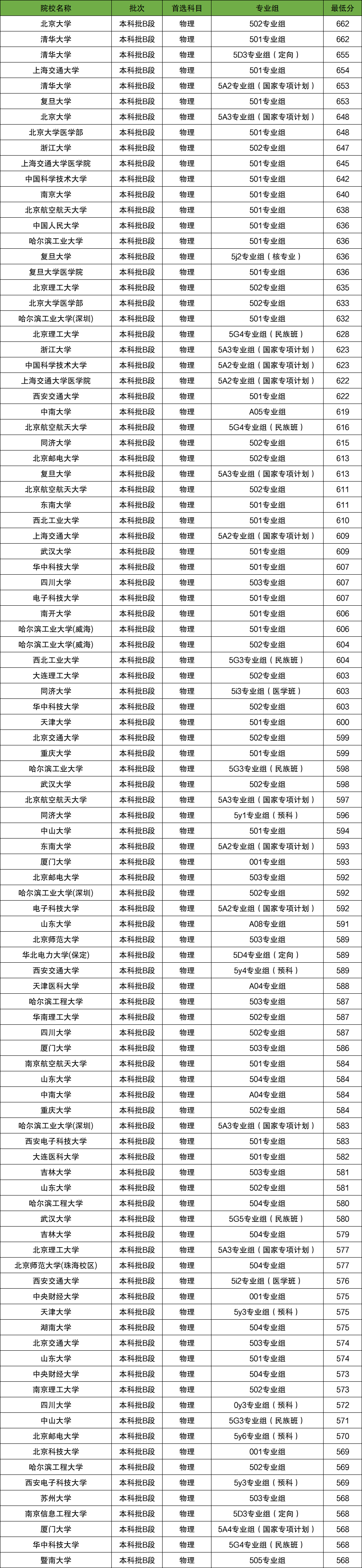 本科招生录取的大学中,录取分数线最高的是清华大学(501专业组)、北京大学(502专业组),2025年最低分是662分,对应全回族自治区位次是第104名以内。分数线排名靠前的还有上海交通大学(501专业组)654分、复旦大学(501专业组)653分、浙江大学(502专业组)647分等。