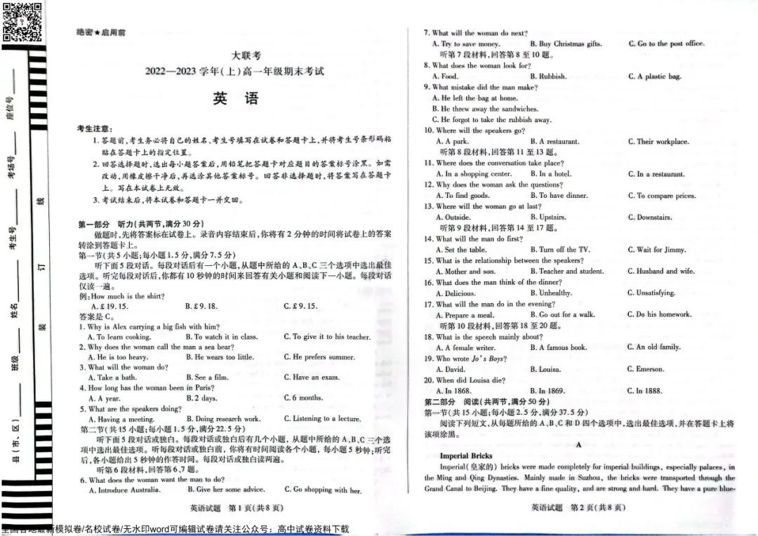 天一大联考2022-2023高一期末考即将开考,等考试结束,同学们应该很关注天一大联考2022-2023各科试卷及答案汇总。在本文高考100网将会整理天一大联考2022-2023高一期末考英语试卷及答案各科汇总,供同学们参考。希望同学们通过这份资料,对成绩进行评估后,进行查漏补缺,从而更好达到期末考的作用!