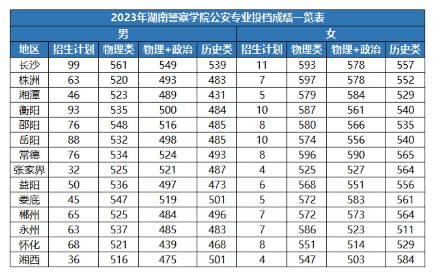由于学校在各地市的招生计划有所区别,因此分数线也同样有较大出入。如株洲市选考物理+政治的男生报考湖南警校最低仅需493分,历史类考生则需要483分。下文也为大家整理了学校提前批公安专业在各地市的投档分数,一起来了解一下哪些考生能以400-500分的成绩报考湖南警察学院吧!