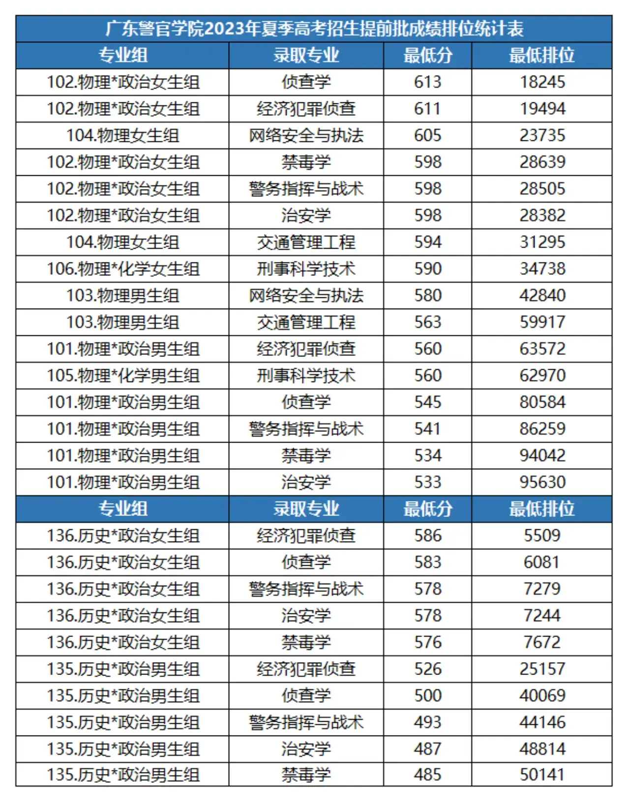 警务指挥与战术专业,面向选科为历史+政治的男生投档最低分是493分;