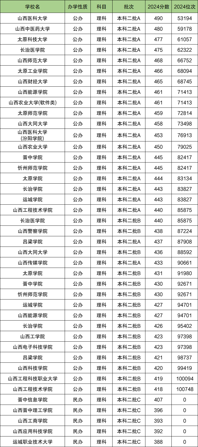 下文为2024年山西省二本大学在山西理科录取分数线和位次排名表,供大家参考:
