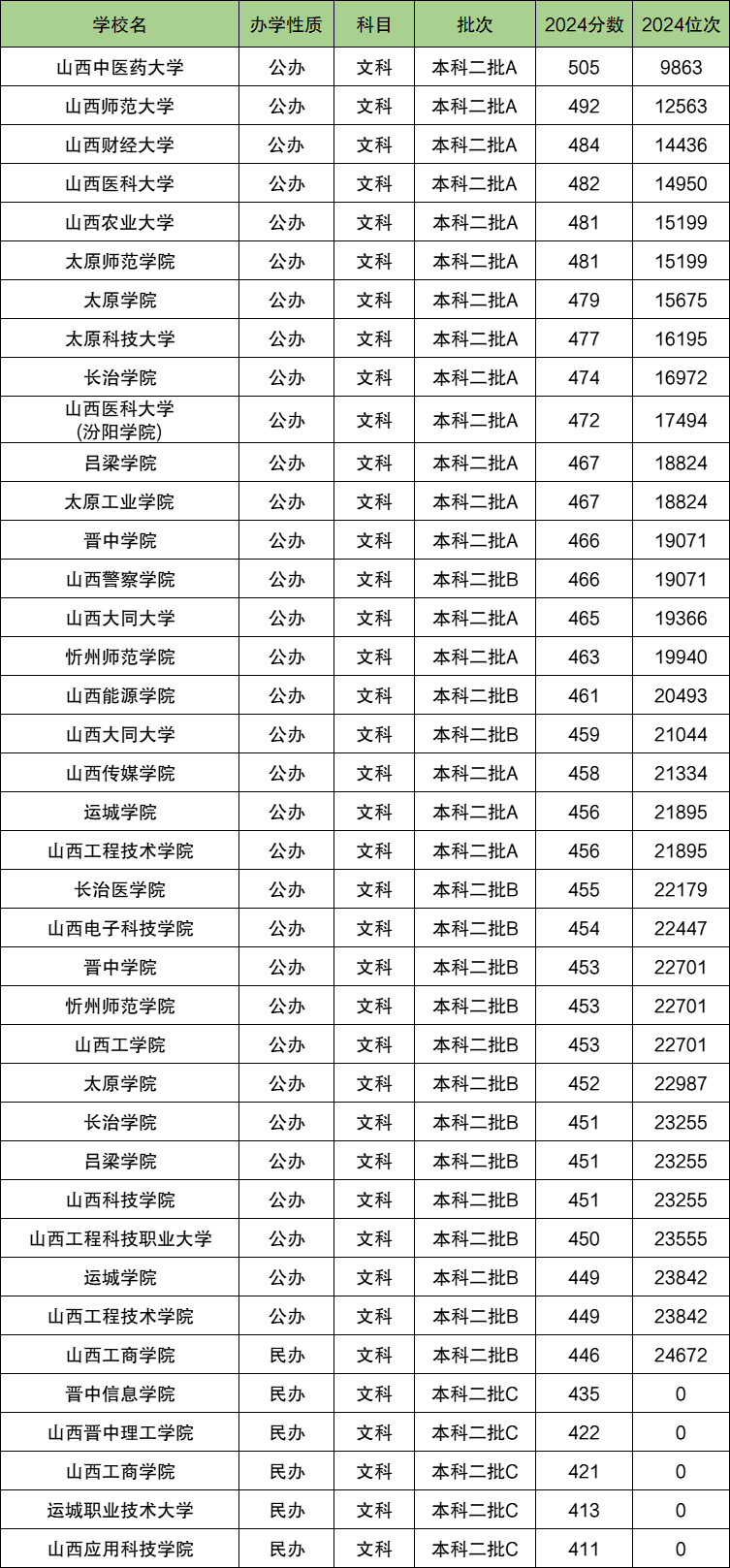 下文为2024年山西省二本大学在山西文科录取分数线和位次排名表,供大家参考: