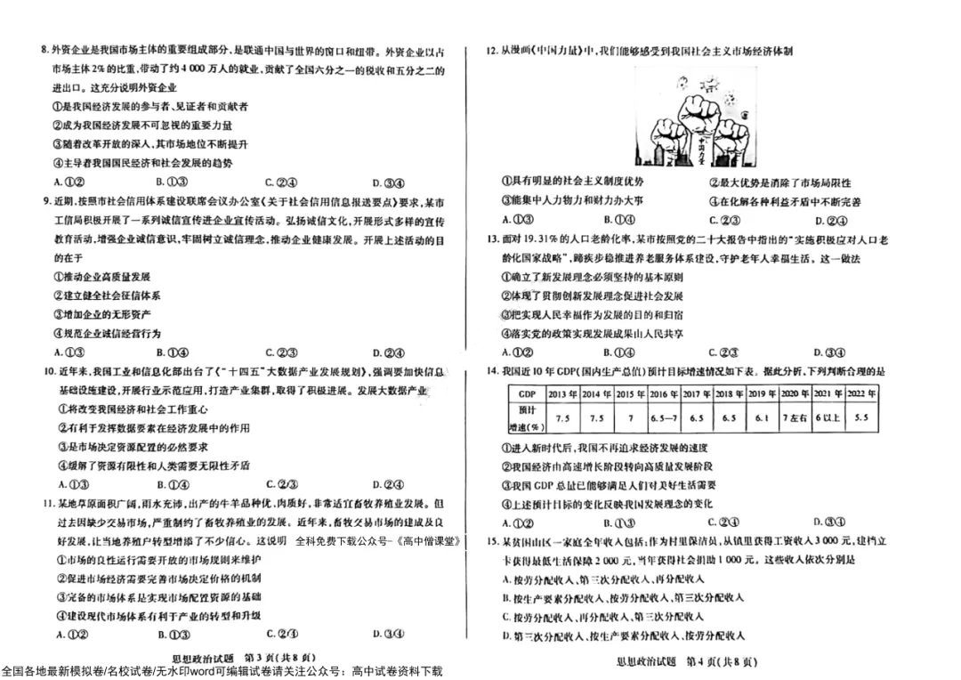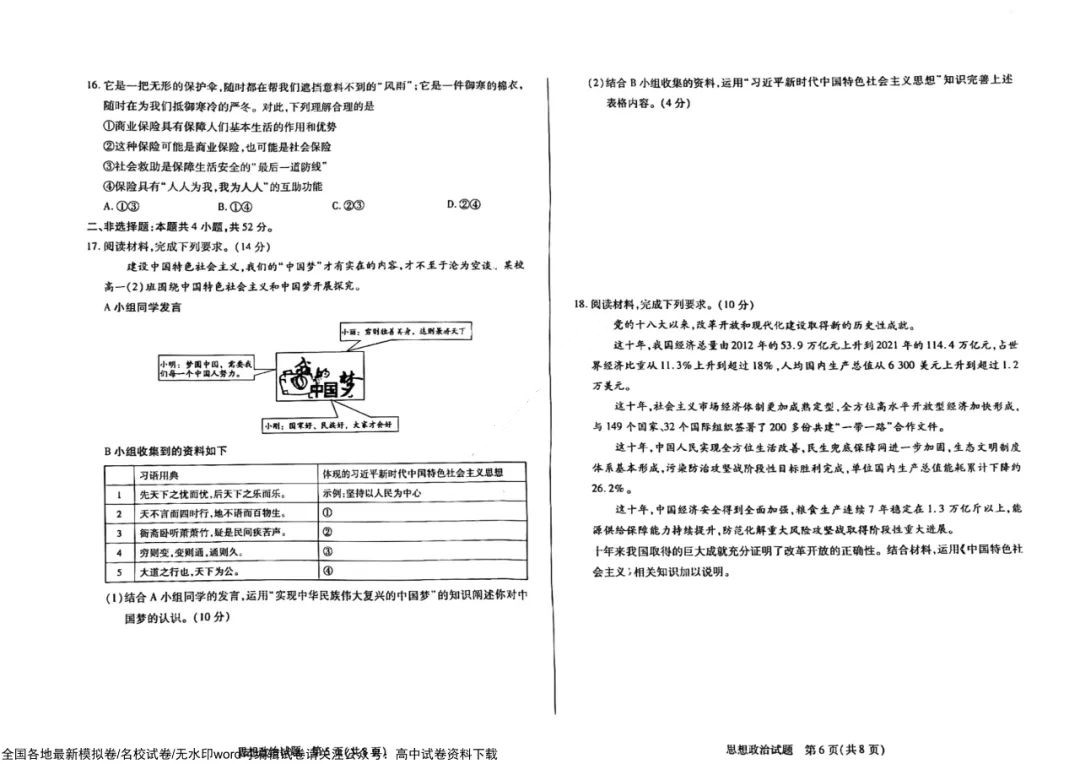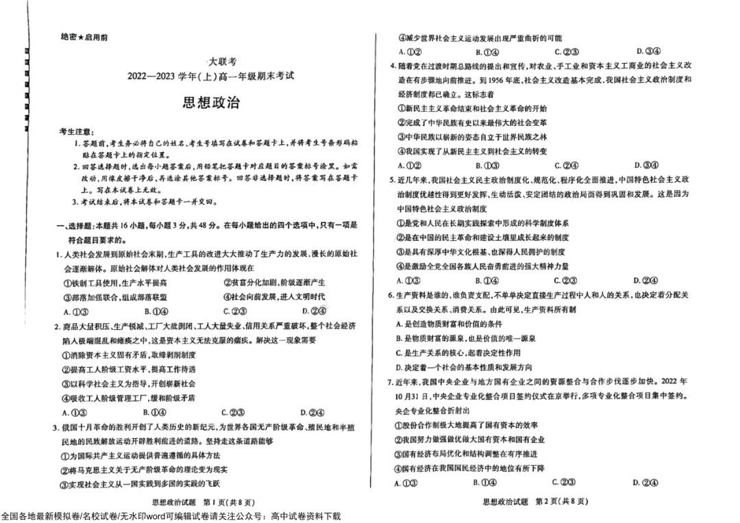 天一大联考2022-2023高一期末考政治试卷及答案汇总