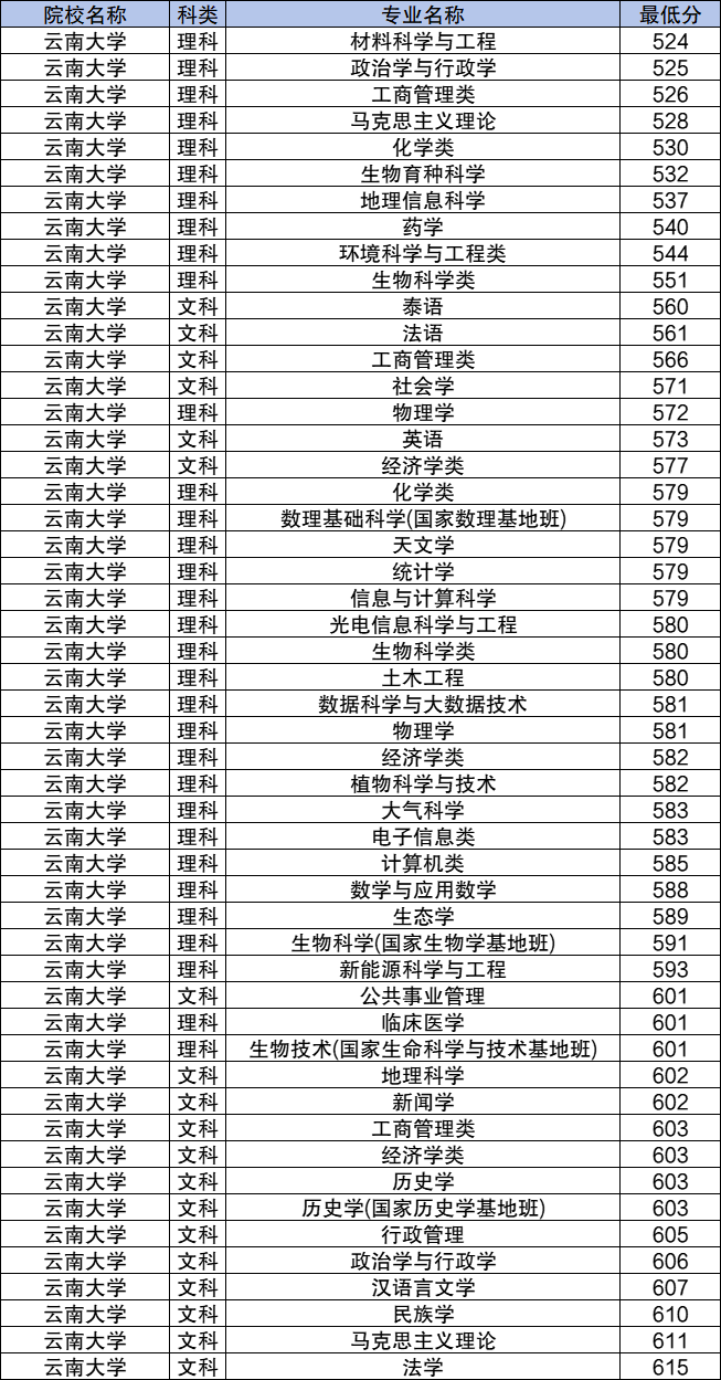 学校地方专项计划文科最低分数线是560分,对应的招生专业是泰语;理科最低分数线是524分,对应的招生专业是材料科学与工程。