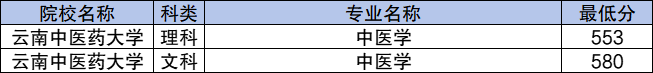 学校地方专项计划文科最低分数线是580分,对应的招生专业是中医学;理科最低分数线是553分,对应的招生专业是中医学。