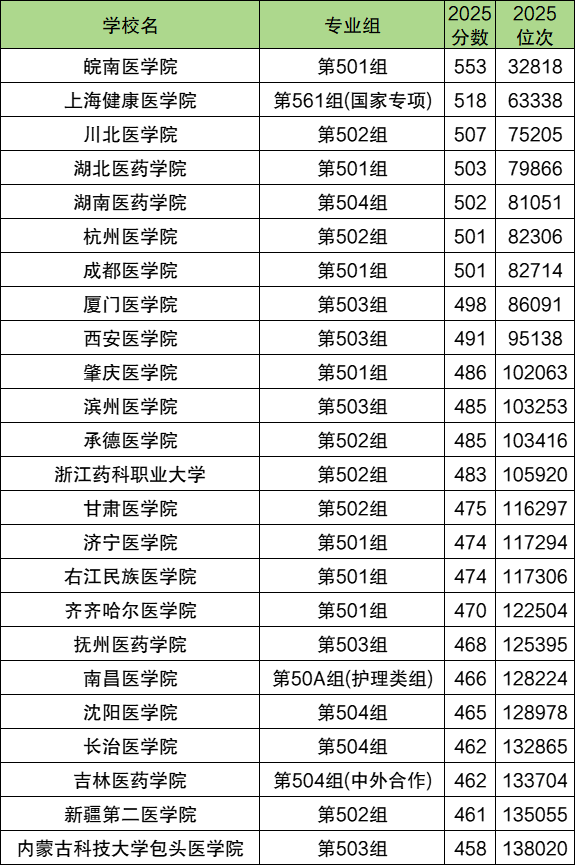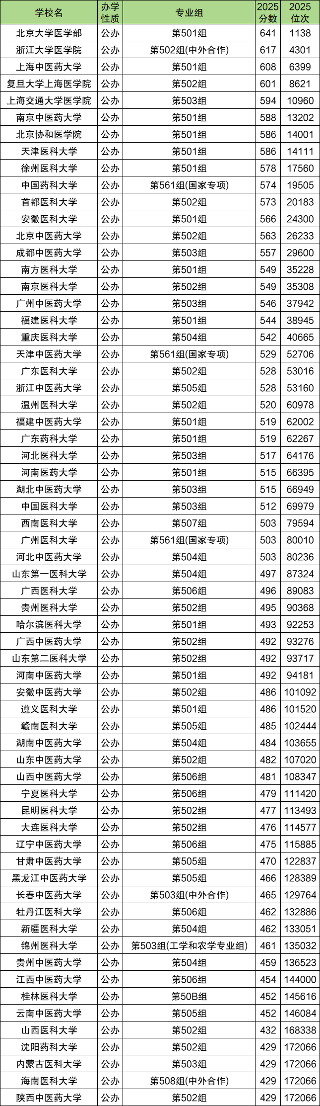 下面是2025年所有公办医学院最低录取分数线及专业组排名一览表: