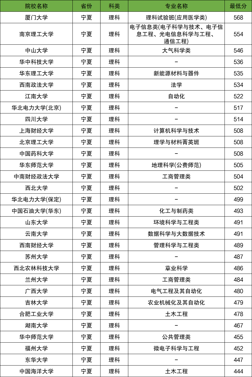 下表为所有大学在宁夏回族自治区理科的专业及分数线。
