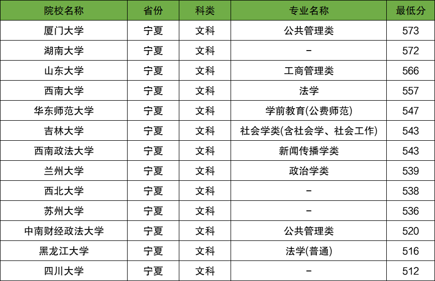 下表为所有大学在宁夏回族自治区文科的专业及分数线。