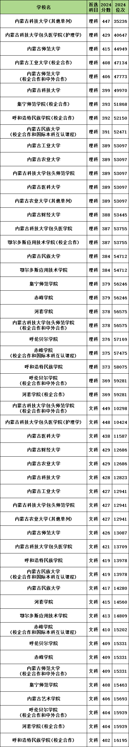 2024年内蒙古所有公办二本录取分数线一览表如下,数据较多,可滑动查看: