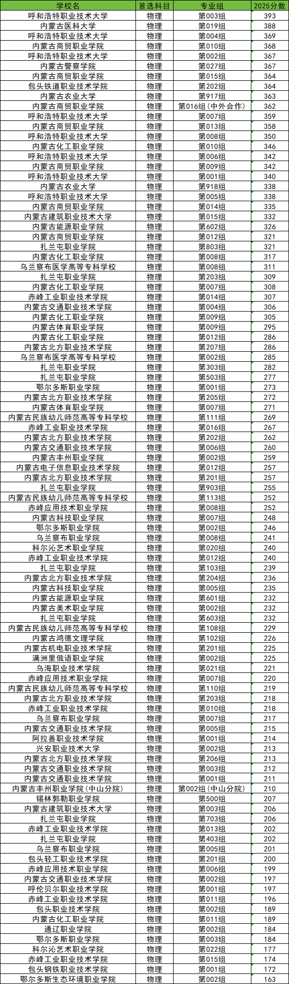 下面是2025年内蒙古自治区内专科高校物理类录取分数线一览表: