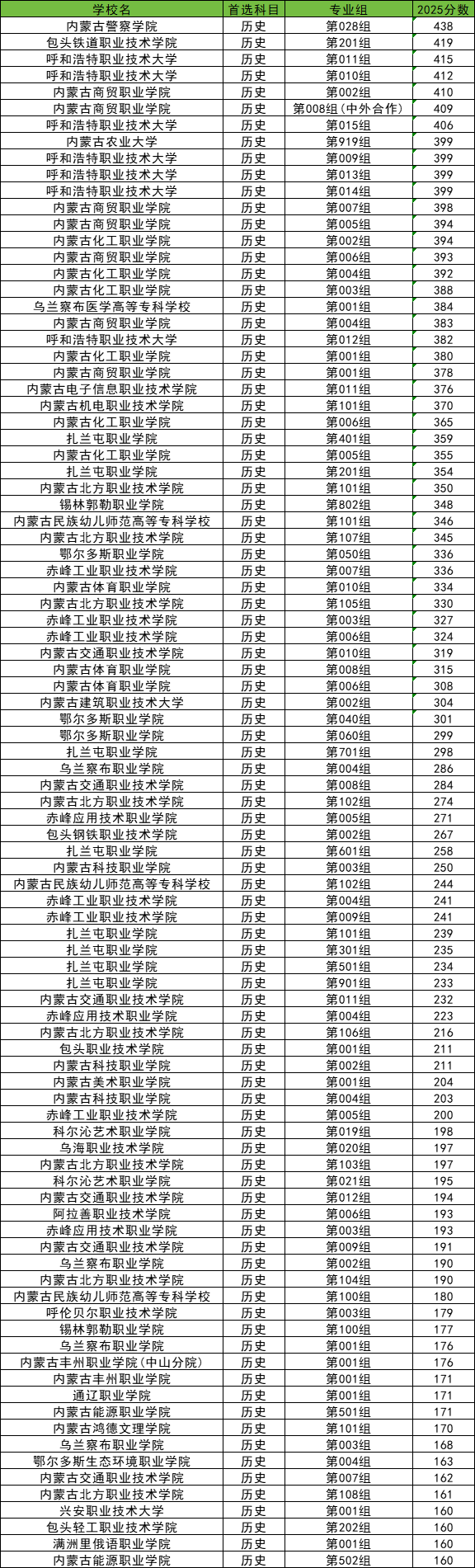 下面是2025年内蒙古自治区内专科高校历史类录取分数线一览表: