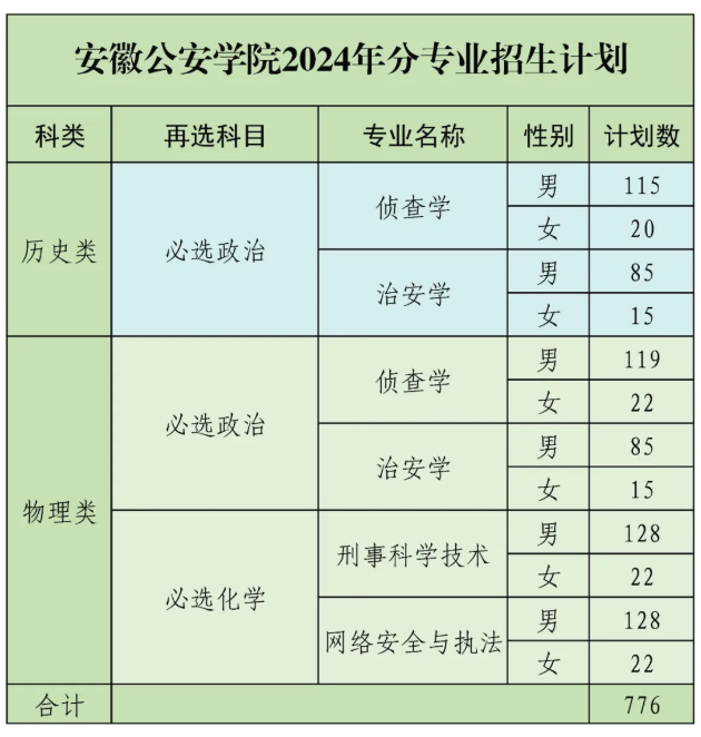 安徽公安学院招生简章已公布,2024招生计划776人,其中刑事科学技术150人,招生专业包括侦查学、治安学、刑事科学技术、网络安全与执法。