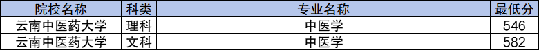 学校国家专项计划文科最低分数线是582分,对应的招生专业是中医学;理科最低分数线是546分,对应的招生专业是中医学。