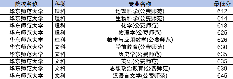 学校国家专项计划文科最低分数线是630分,对应的招生专业是学前教育(公费师范);理科最低分数线是612分,对应的招生专业是地理科学(公费师范)。