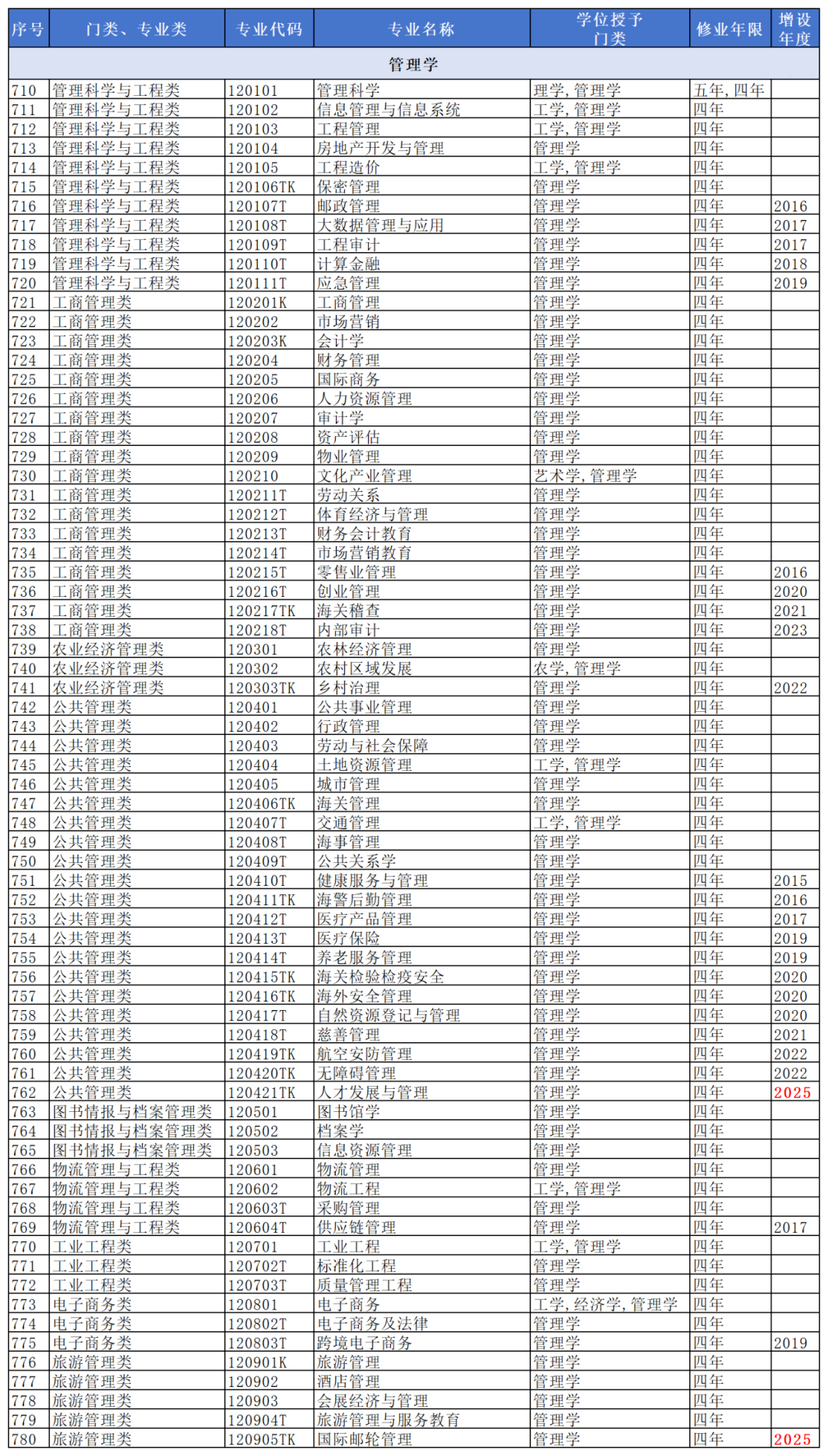 管理学学科门类包含管理科学与工程类、工商管理类、农业经济管理类、公共管理类、图书情报与档案管理类、物流管理与工程类、工业工程类、电子商务类、旅游管理类这9个专业类,具体有工商管理(120201K)、会计学(120203K)、行政管理(120402)、电子商务(120801)、旅游管理(120901K)等71个专业。