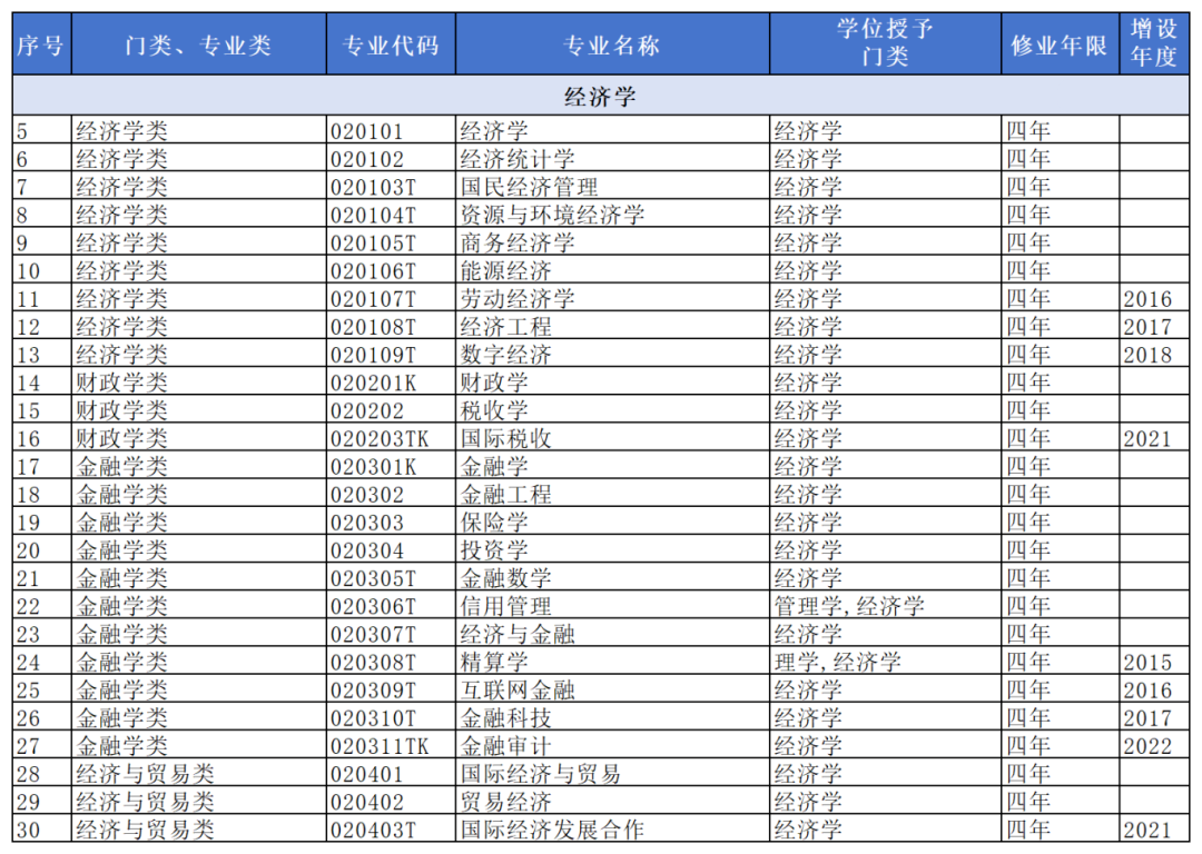 经济学学科门类包含财政学类、金融学类、经济学类、经济与贸易类这4个专业类,具体有经济学(020101)、经济统计学(020102)、金融学(020301K)、金融工程(020302)、 国际经济与贸易(020401 )等26个专业。