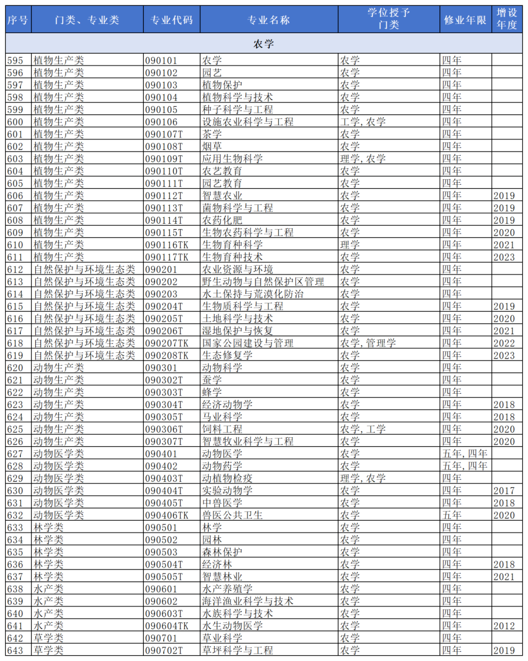 农学学科门类包含植物生产类、自然保护与环境生态类、动物生产类、动物医学类、林学类、水产类、草学类这7个专业类,具体有农学(090101)、园艺(090102)、动物科学(090301)、动物医学(090401)、林学(090501)等49个专业。