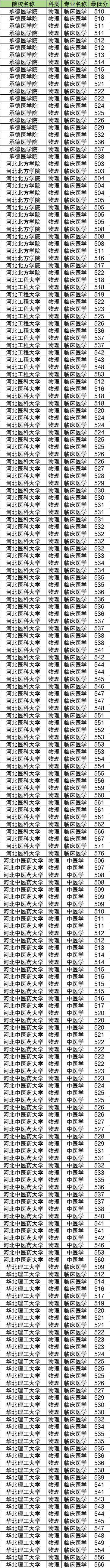 一般来说免费医学定向生分数线在500分左右,下面以河北地区为例,整理免费医学定向生各校录取分数线如下: