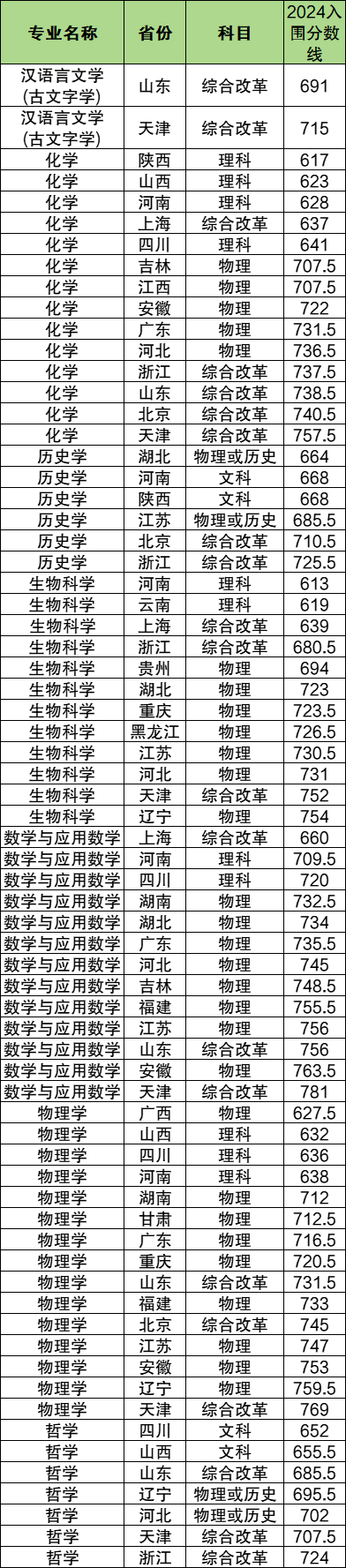 南开大学强基计划入围分数线为:山东最低685.5分、北京最低710.5分、天津最低707.5分等;各专业分数线为:化学617分-757.5分、历史学664分-725.5分等。