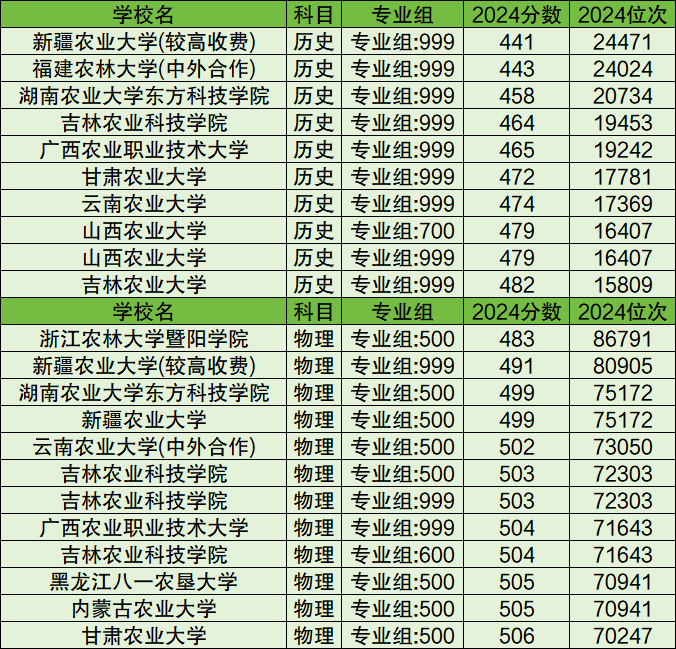 根据数据可知,2024年福建省历史类收分最低的农业大学是新疆农业大学(较高收费),最低录取分为441分;物理类收分最低的也是浙江农林大学暨阳学院,最低录取分为483分。