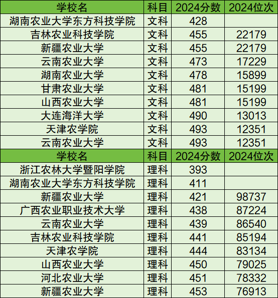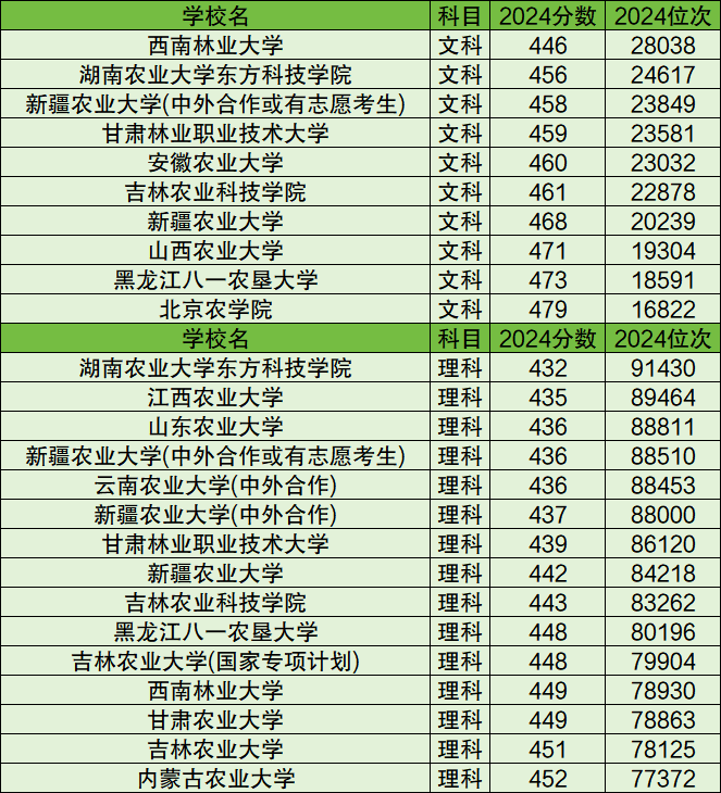 根据数据可知,2024年陕西省文科收分最低的农业大学有西南林业大学,最低录取分为446分;理科收分最低的也是湖南农业大学东方科技学院,最低录取分为432分。