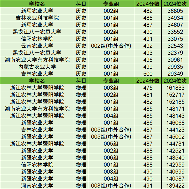 根据数据可知,2024年安徽省历史类收分最低的农业大学有新疆农业大学,最低录取分为482分;物理类收分最低的是浙江农林大学暨阳学院,最低录取分为475分。