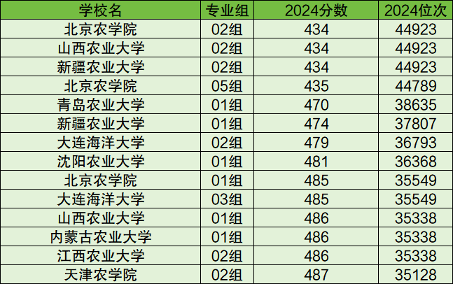 根据数据可知,2024年北京市收分最低的农业大学有北京农学院、山西农业大学、新疆农业大学,最低录取分为434分。