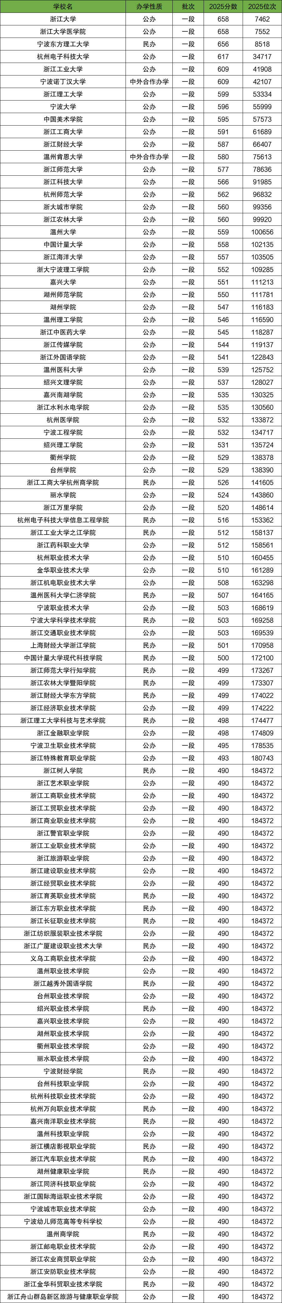 2025年浙江一段各大学在浙江最低录取分数线位于490分-658分范围内,位次位于184372名-7462名之间。