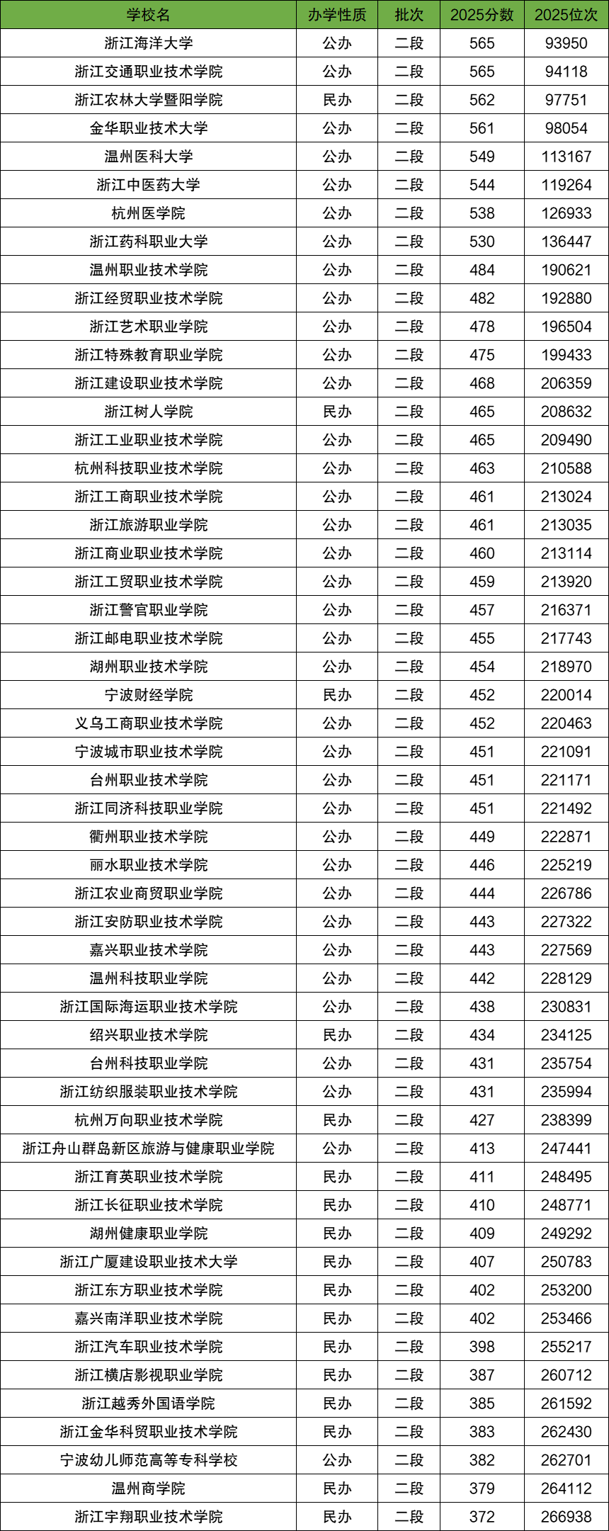 2025年浙江二段各大学在浙江最低录取分数线位于372分-565分范围内,位次位于266938名-93950名之间。