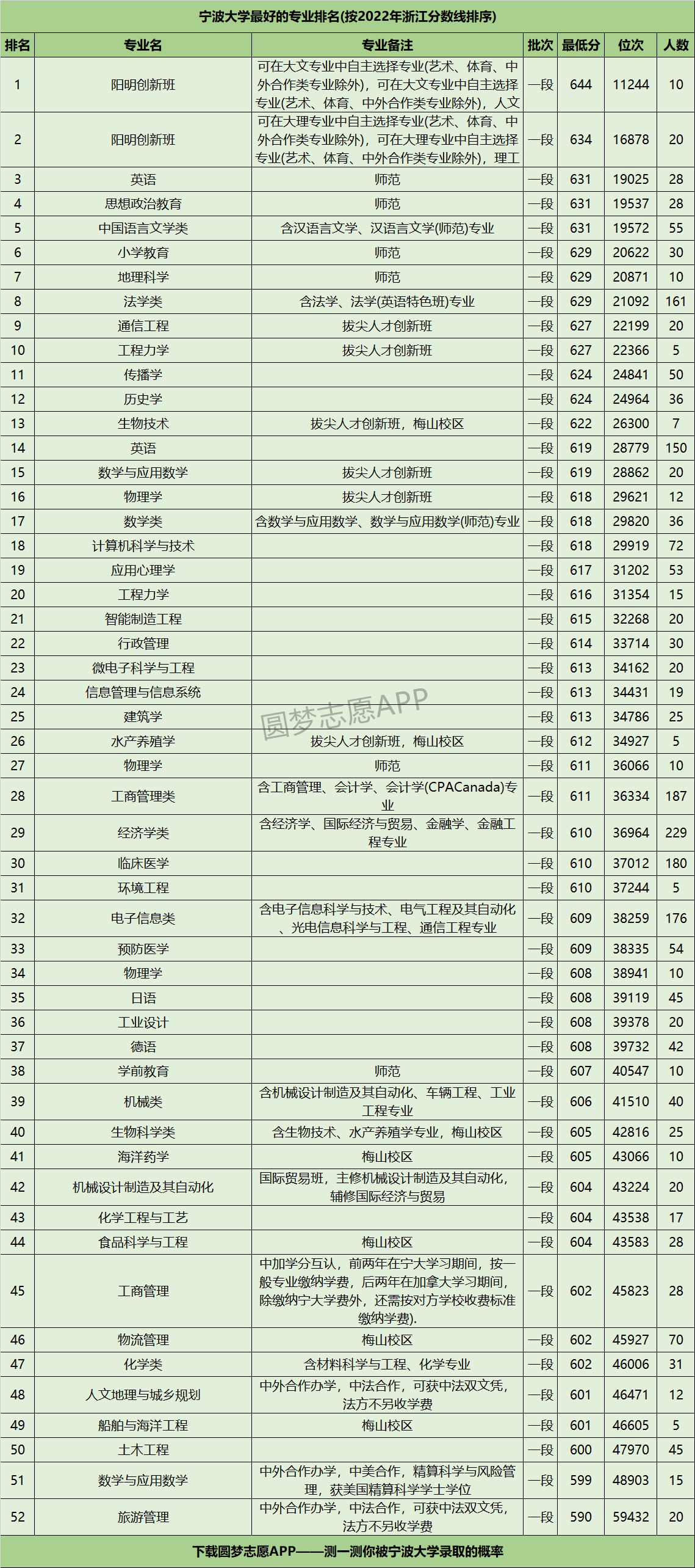 友情提醒:下载圆梦志愿APP,可查阅宁波大学在你的高考省份各专业的录取分数线、位次排名。(各大手机应用市场均可下载圆梦志愿APP)