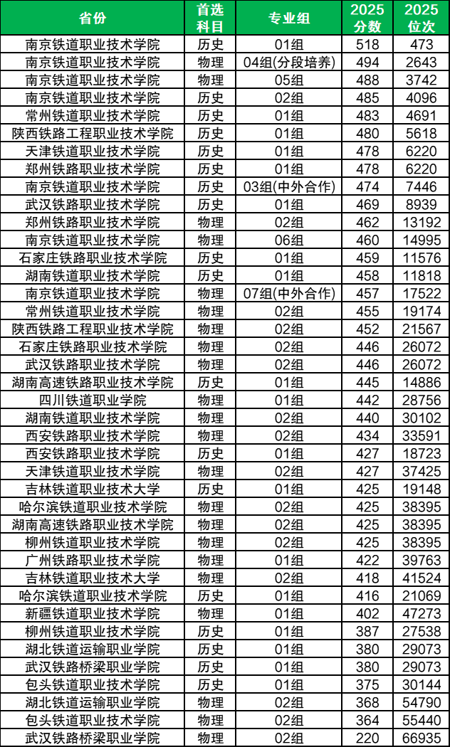 由于铁路学校在各省的专科录取分数线有所差异,在此以河北和江苏为例,整理了铁路学校2025年在这两个省市的录取分数线,详情如下:
