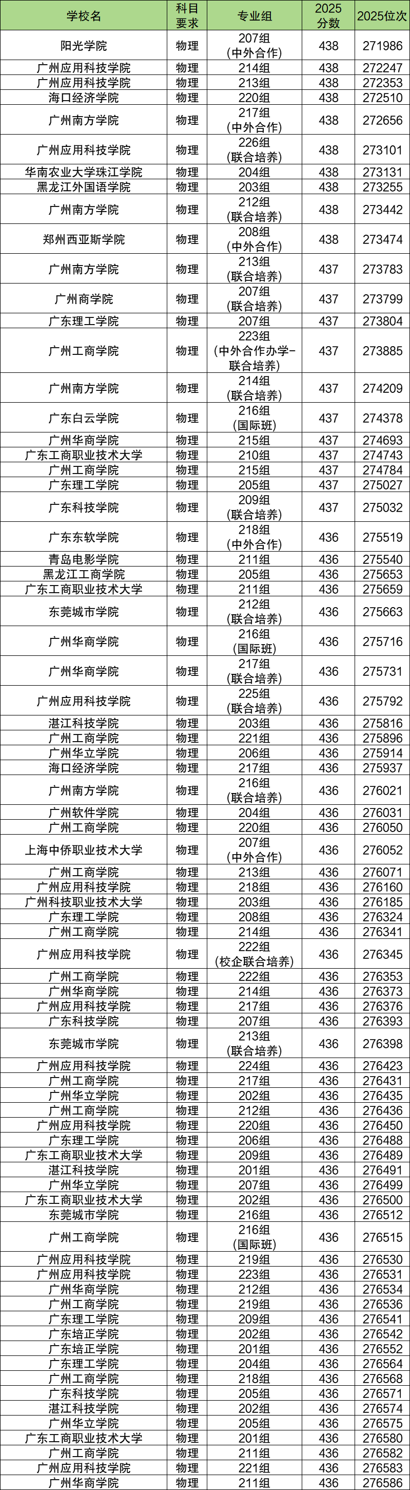 2025年广东物理类本科批分数线附近(436分到438分)能上的本科院校一共有24个,排名靠前的有阳光学院(207组(中外合作),271986名)、广州应用科技学院(214组,272247名)、广州应用科技学院(213组,272353名)等,这些属于本科批分数线附近考生可以冲一冲的学校。